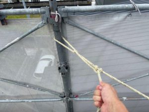 でも一応、工事中の現場の足場はシートをたたんで、あとは、足場をトラックで荷物を運ぶときに使うロープで縛っておきます