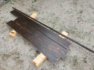 ただ、しっかり焼いて炭化させる”焼杉”より耐久性は劣るので、この上から保護塗料を塗ります