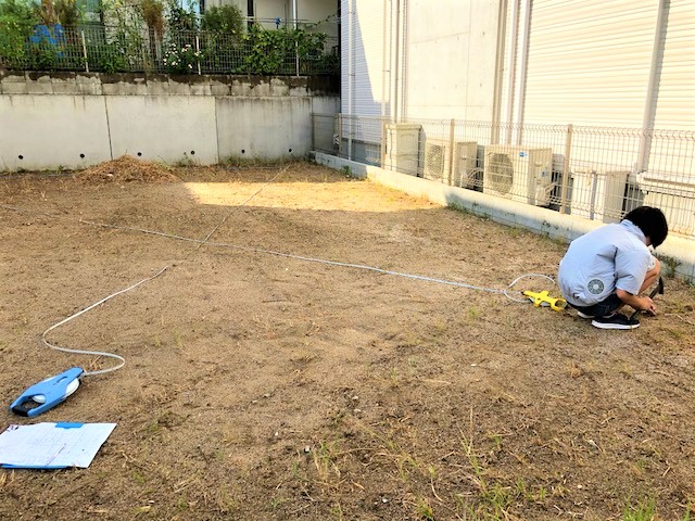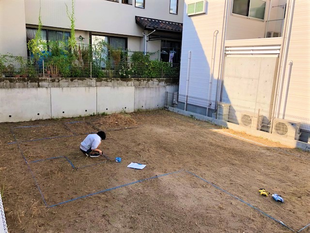 地縄とは、実際の土地に家の輪郭を縄(今回は水色のビニールロープ)で描いて建物の配置やこの先の工事の目安にしていきます