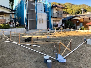 先日安佐南区の現場で基礎着工前のやり方(墨出し)を行ってきました