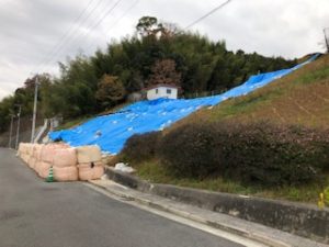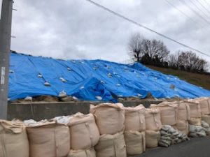 災害当時から比べれば、道路が清掃され、大型の土嚢袋とブルーシートが張られたぐらい